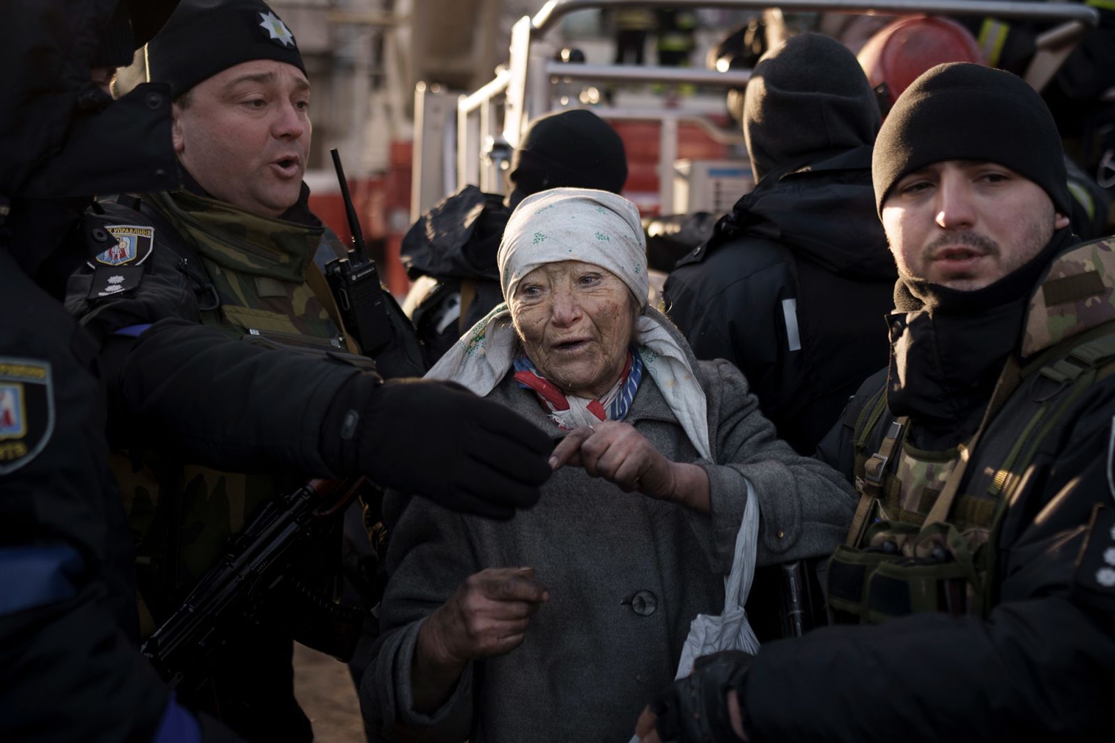 Полицейские помогают пожилой женщине после того, как ее спасли из квартиры, пострадавшей от обстрела, в Киеве 15 марта. An elderly woman is helped by police officers after she was rescued from an apartment that was hit by shelling in Kyiv on March 15. Photo: Felipe Dana/AP