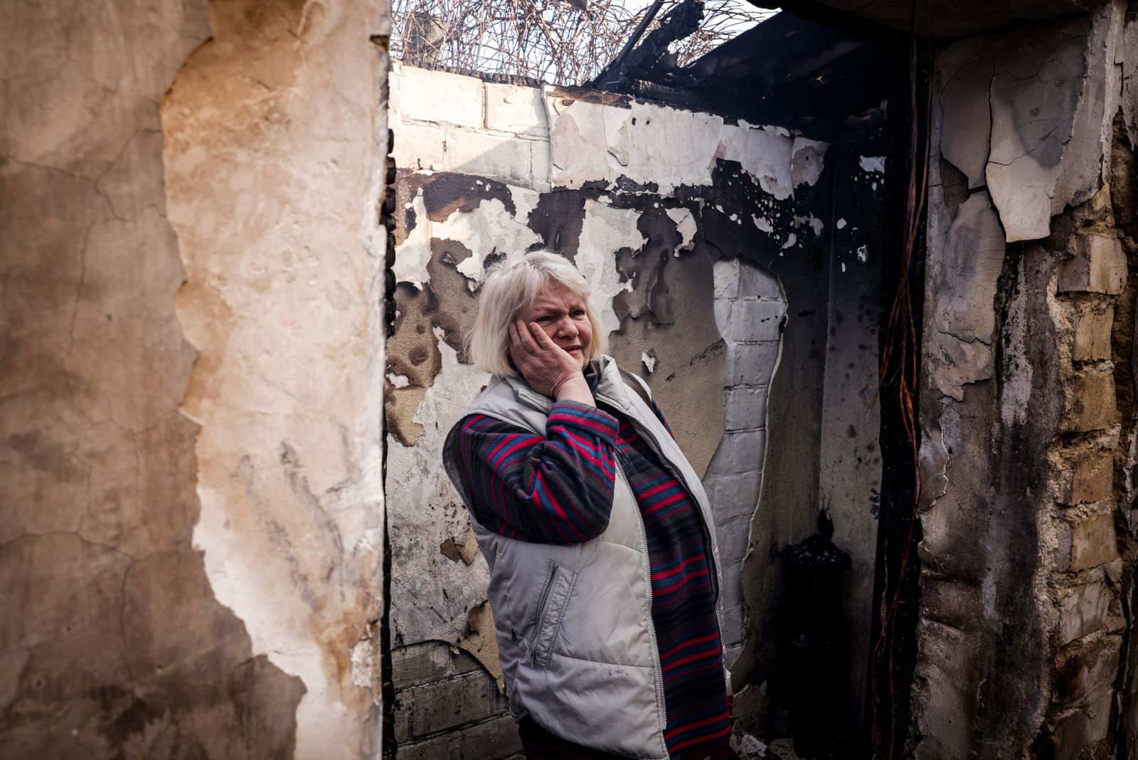 Светлана Илюхина смотрит на обломки своего дома в Киеве после ракетного обстрела Россией 23 марта. «Сначала был дым, а потом все почернело», — сказала она. Svetlana Ilyuhina looks at the wreckage of her home in Kyiv following a Russian rocket attack on March 23. "First there was smoke, and then everything went black," she said. Photo: Ivor Prickett/The New York Times/Redux