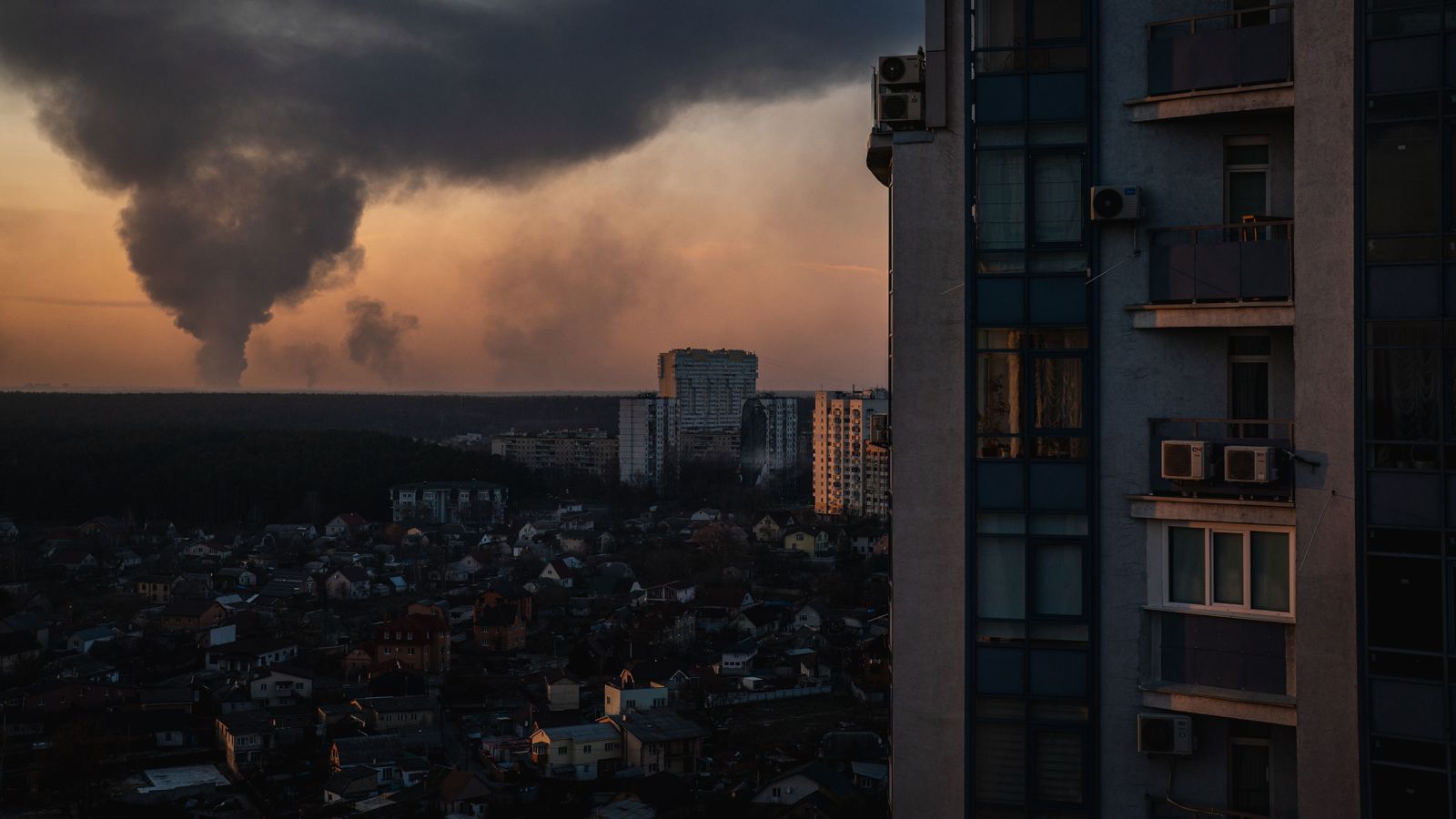 Дым виден на горизонте недалеко от Киева, Украина, в пятницу, 25 марта. Smoke is seen along the horizon near Kyiv, Ukraine, on Friday, March 25. Photo: Wolfgang Schwan/Anadolu Agency/Getty Images
