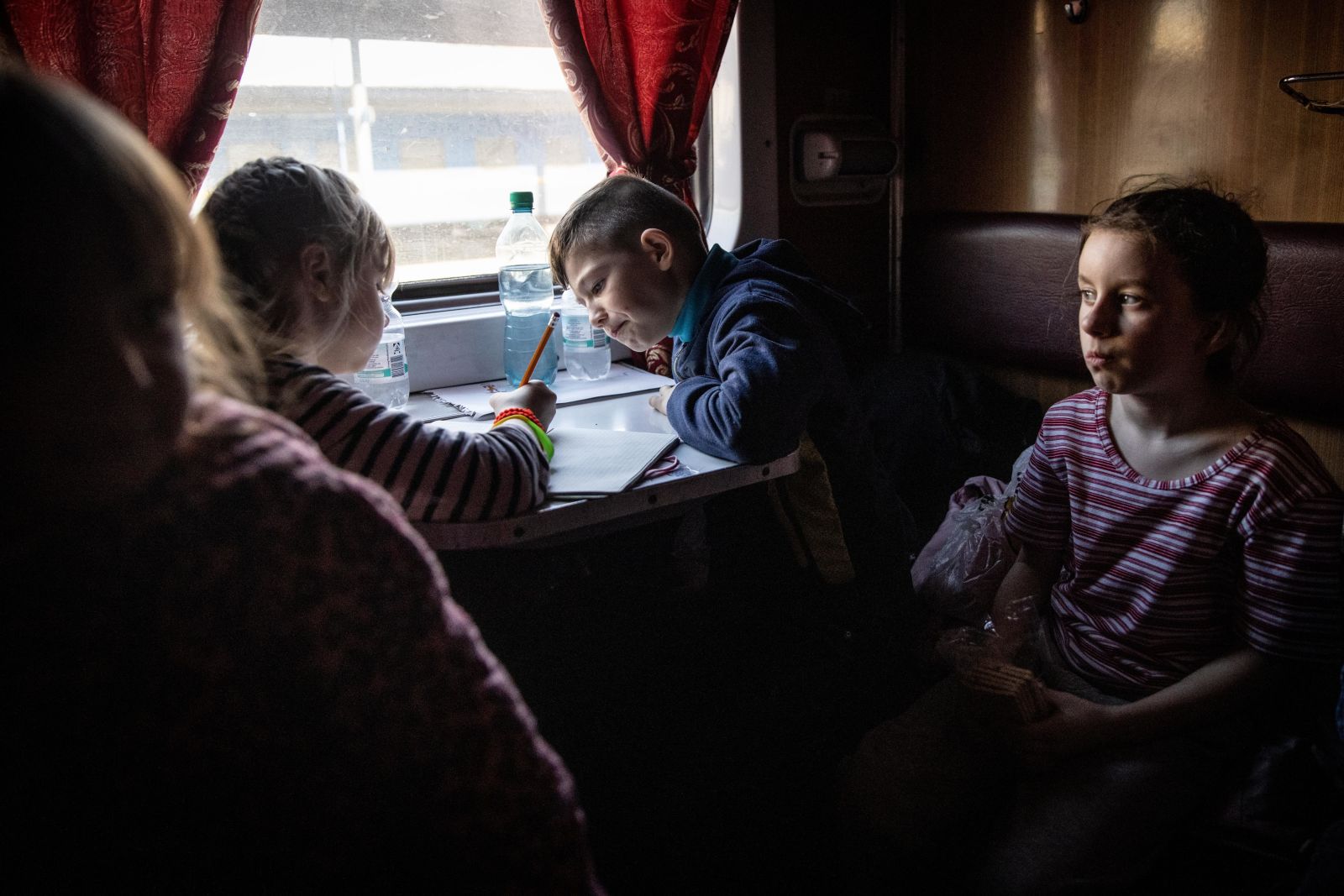Дети-сироты едут на поезде после бегства из контролируемого Россией города Пологи, Украина, в субботу, 26 марта. Orphaned children travel by train after fleeing the Russian-controlled town of Polohy, Ukraine, on Saturday, March 26. Photo: Chris McGrath/Getty Images