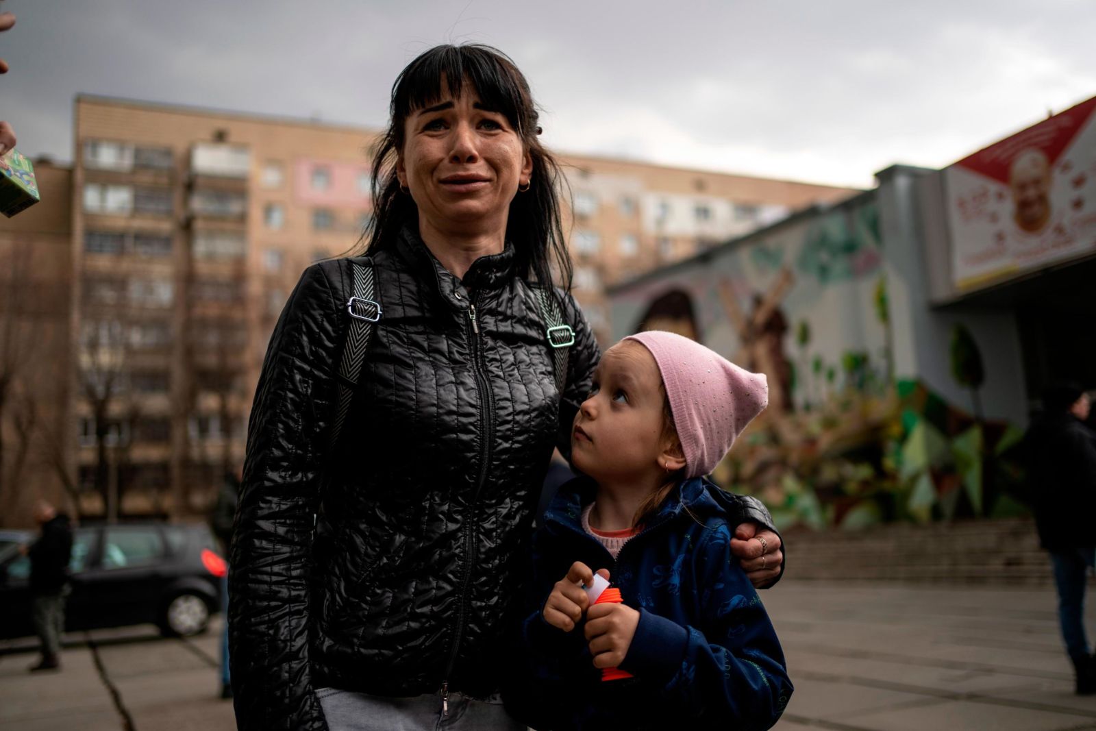 Женщина по имени Юлия плачет рядом со своей 6-летней дочерью Вероникой во время общения с прессой в Броварах, Украина, 29 марта. A woman named Julia cries next to her 6-year-old daughter, Veronika, while talking to the press in Brovary, Ukraine, on March 29. Photo: Rodrigo Abd/AP