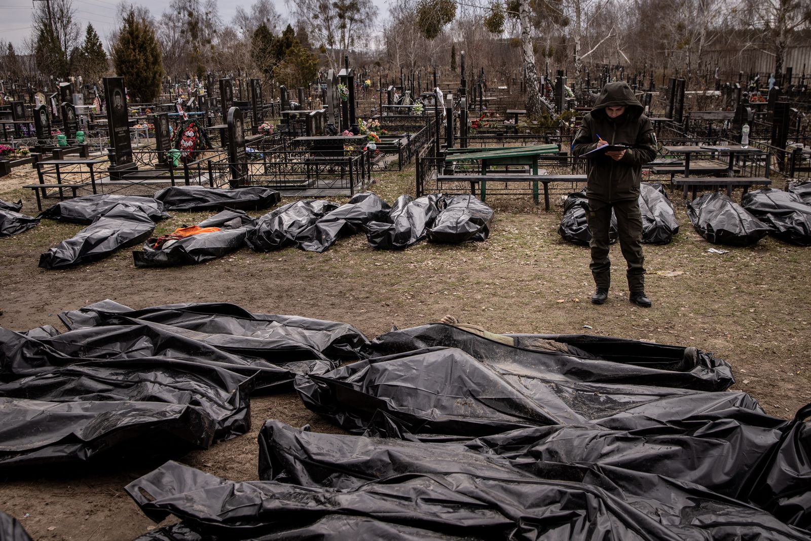 Мужчина работает над каталогизацией некоторых тел мирных жителей, убитых в Буче и ее окрестностях. Шокирующие кадры, на которых видны тела мирных жителей, разбросанные по улицам Бучи, пригорода Киева, вызвали международное возмущение и повысили актуальность продолжающихся расследований предполагаемых военных преступлений России. A man works to catalog some of the bodies of civilians who were killed in and around Bucha. Shocking images showing the bodies of civilians scattered across the streets of Bucha, a suburb of Kyiv, sparked international outrage and raised the urgency of ongoing investigations into alleged Russian war crimes. Photo: Chris McGrath/Getty Images