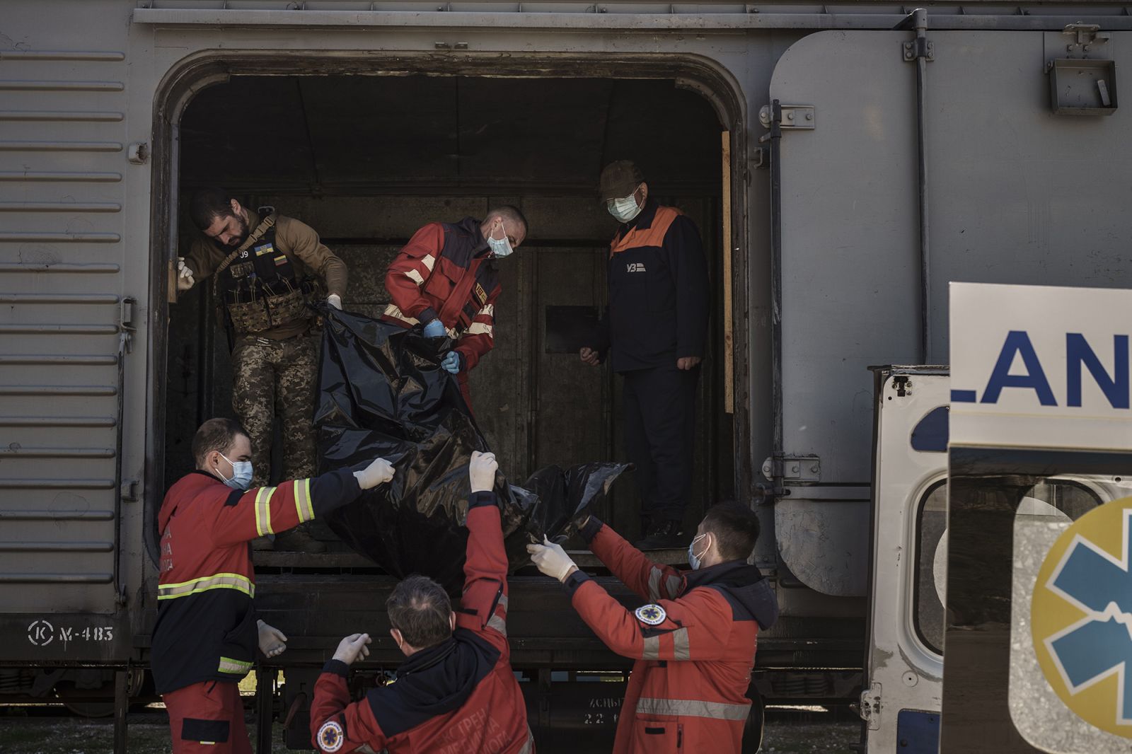 Украинские военнослужащие и спасатели несут тело российского солдата в рефрижератор в Харькове, Украина, 5 мая. В рефрижераторе хранятся тела более 40 российских солдат, найденных после боев под Харьковом. Ukrainian serviceman and emergency workers carry the body of a Russian soldier into a refrigerated train in Kharkiv, Ukraine, on May 5. The bodies of more than 40 Russian soldiers who were found after battles around Kharkiv are being stored in the refrigerated car. Photo: Felipe Dana/AP