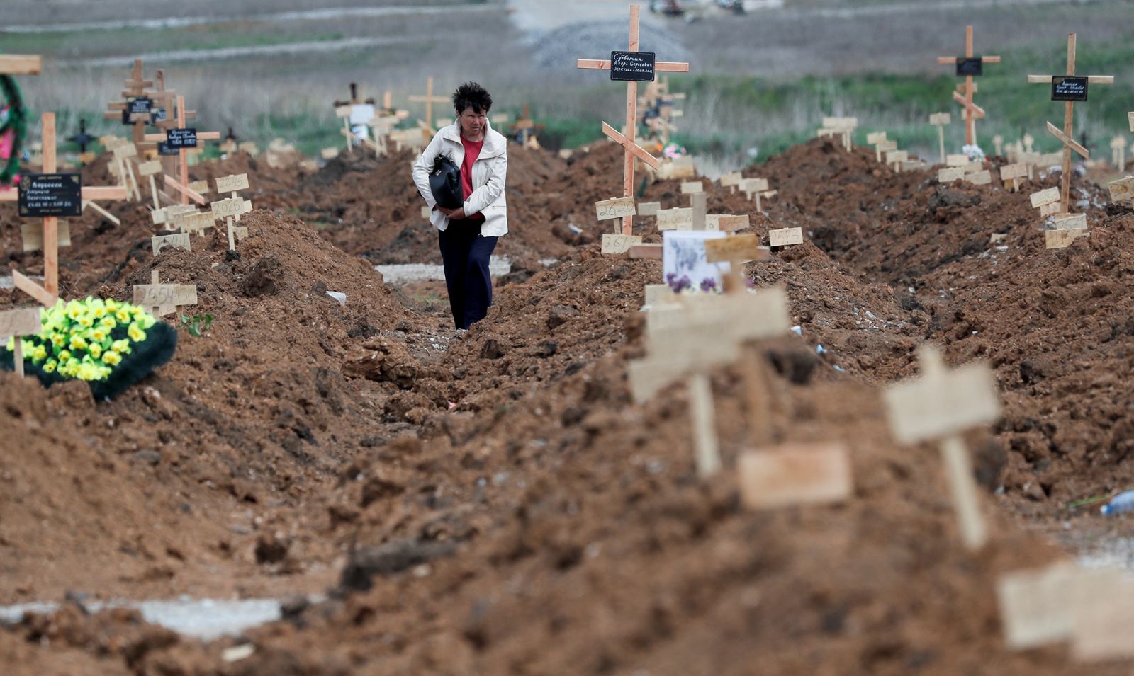 Женщина по имени Татьяна ищет могилу мужа в поселке Старый Крым под Мариуполем, 15 мая. A woman named Tatyana searches for her husband's grave in the settlement of Staryi Krym, outside Mariupol, on May 15 Photo: Alexander Ermochenko/Reuters