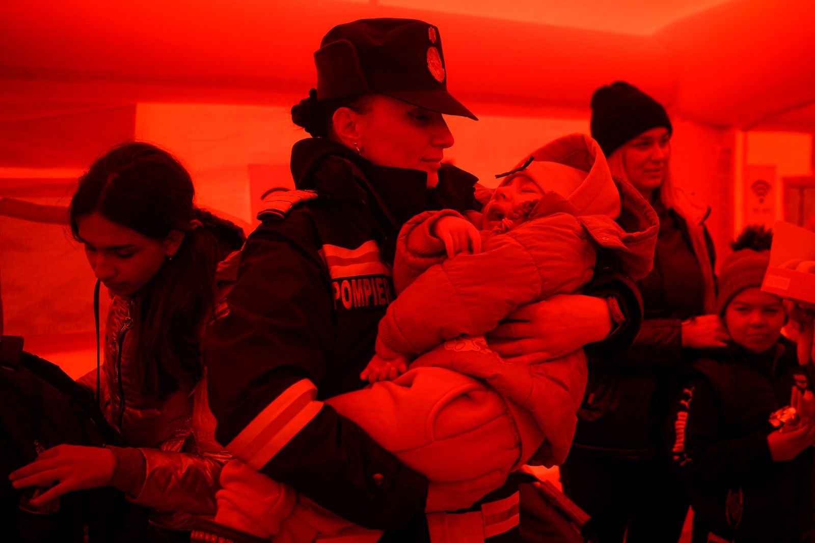 Пожарный держит украинского ребенка, который только что прибыл на пароме на пограничный переход Исакча-Орловка в Румынии 25 марта. A firefighter holds a Ukrainian child who had just arrived by ferry at the Isaccea-Orlivka border crossing in Romania on March 25. Photo: Andreea Alexandru/AP
