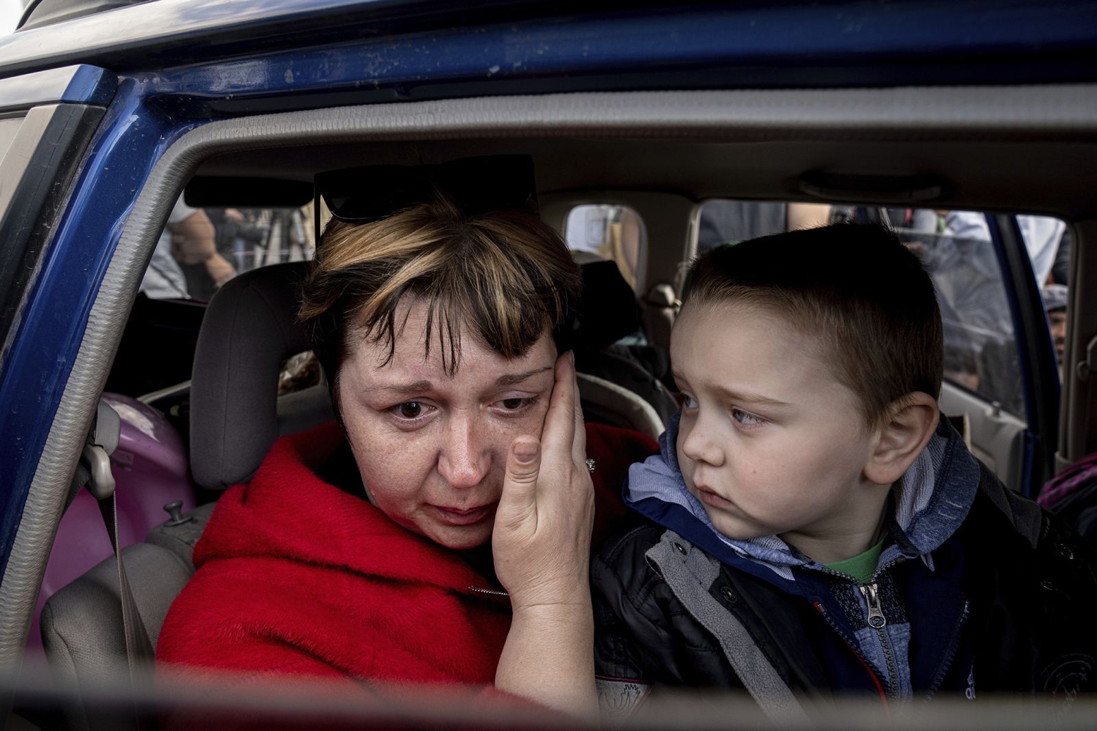 Наталья Потоцкая плачет рядом со своим внуком Матвеем, когда они прибывают в центр для перемещенных лиц в Запорожье, Украина, в понедельник, 2 мая. Natalia Pototska cries next to her grandson Matviy as they arrive at a center for displaced people in Zaporizhzhia, Ukraine, on Monday, May 2. Photo: Evgeniy Maloletka/AP